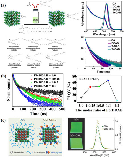 (a) Quaternary ammonium bromide ligand materials with different bulkiness and length. Adapted with permission from [78]. Copyright 2019, American Chemical Society. (b) PLQY and PL decay curves of DDAB-CsPbBr3 QDs with different molar ratios of Pb: DDAB. Reproduced with permission from [80]. Copyright 2021, ELSEVIER. (c) OIHL passivation strategy for IPQDs. Reproduced with permission from [82]. Copyright 2018, Wiley.