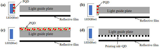 (4) In dot (micro-structure integration). As shown in Figure 9d, the micro-structure is fabricated by a screen printing or an inkjet printing process which contains the mixture of red/green QDs and ink, then the mixed QD slurry is printed on the bottom surface of the light guide plate for light mixing and diffusion [94,106,117]. The red and green emissions are converted by red and green QDs under the excitation of the edge-lit blue LED. These micro-structural arrays can be optimized for better uniformity and extraction efficiency [118]. Uniform white light could be achieved by adjusting the proportion of the red and green QDs in the mixture. The current challenge is the ink configuration and environmental exposure.