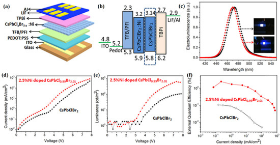 (a,b) Schematic diagram and band level of the PeQLED based on 2.5% Ni2+ ion-doped CsPbCl0.99Br2.01 QDs. (c) The EL spectra and photos of the PeQLED based on CsPbClBr2 QDs (black) and 2.5% Ni2+—doped CsPbCl0.99Br2.01 QDs (red), respectively. (d–f) Current density, luminance, and EQE of the corresponding devices. Adapted with permission from [130]. Copyright 2020, American Chemical Society.