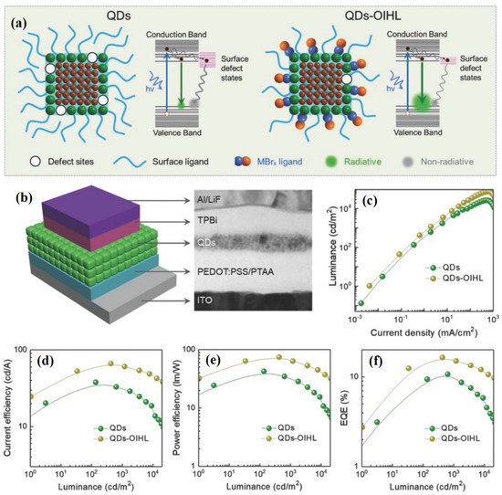 Actually, surface ligand engineering plays an important role in the performance enhancement of PeQLED. Although surface capping ligands could remove surface trap states to improve the stability of PQDs, they also form an insulating film to hinder the charge injection and transport inside the light-emitting layer of PeQLED. Therefore, appropriate surface ligand modification benefits the performance enhancement of PeQLED. Lee et al. [131] utilized a short amine ligand to enhance the efficiency of FAPbBr3-based PeQLED. The reported FAPbBr3−n-butylamine-based PeQLED had a high performance with CE of 9.16 cd/A, a PE of 6.4 lm/W, and 2.5% EQE. Han [124] exploited 3,3-diphenylpropylamine bromide (DPPA-Br) as surface capping ligands to fabricate uniform FAPbBr3 QDs. The resulting PeQLED demonstrated an excellent performance with a maximum luminance of 13,970 cd/m2, a CE of 66.3 cd/A, and 16.3% EQE. Song et al. [82] explored an organic-inorganic hybrid ligand to passivate the surface trap state and enhance the carrier injection of PQDs, including the use of ZnBr2, MnBr2, GaBr3, and InBr3. As a result, the ZnBr2-passivated PeQLED showed superior performance with a maximum luminance of 76,940 cd/m2, a CE of 66.7 cd/A, a PE of 65.9 lm/W, and 16.48% EQE, while the MnBr2-passivated PeQLED presented a maximum luminance of 100,080 cd/m2, a CE of 60.6 cd/A, and 15.6% EQE (Figure 11). In 2021, Li et al. [132] used FABr to compensate the surface Bromine vacancy of inorganic cesium lead halide PQDs. The corresponding PeQLED with FABr-treated CsPbBr3 QDs (green-emitting) achieved a promising EQE of 7.94% and a luminance of 14,790 cd/m2, which was much higher than those of the pristine (1.78%, 4640 cd/m2) and the DDAB-treated samples (3.91%, 167 cd/m2). This methodology is also suitable for the surface defect passivation of blue-emitting CsPbBr1.3Cl1.7 and red-emitting CsPbBrI2 QDs. The results clearly highlighted that heterogeneous post-passivation could boost the PL and EL performance of inorganic cesium lead halide PQDs simultaneously.