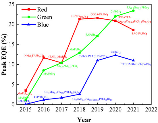 Four basic optical parameters, including emission stability [40], luminous intensity [40,41,42], color diversity [43,44], and color purity [45], can be used to characterize the luminescence properties of PQDs. It is remarkable that these basic characteristics also determine their application feasibility in display devices. Among them, emission stability is related to the crystal lattice of PQD materials, and luminous intensity is mainly determined by PLQY. Color diversity can be regulated by changing the PQDs’ particle size, composition, and type of ionic elements, while color purity is associated with the FWHM of the emission spectrum.