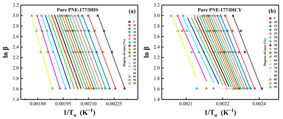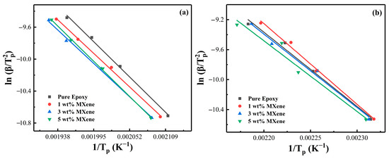 The linear fitting via KAS method with different MXene content: (a) PNE-177/DDS and (b) PNE-177/DICY.