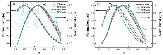 The normalized y(α) vs. z(α) curves of (a) PNE-177/DDS and (b) PNE-177/DICY systems.