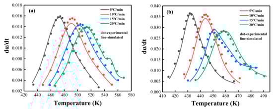 The parameter p was first determined from the value of (Equation (13)), then the logarithm was taken after substituting it into the rate equation (Equation (5)), n and lnA were then obtained from the slope and intercept of the linear correlation with , respectively (Equation (12)). The parameter m was calculated by m = p × n. Then, the kinetic parameters was determined, and the average values were listed in Table S1. The rate equation can be obtained by the calculated kinetics parameters at present. Proposed with the SB (m, n) equation, the kinetics model was verified by comparing the experimental curve of dα/dt vs. T with the simulated curve using the data in Table S1; the comparison is shown in Figure 9. The excellent consistency between the simulated and experimental data indicates that the autocatalytic reaction model was suitable for describing the non-isothermal curing reaction process of PNE-177/DDS and PNE-177/DDS systems [64], and the addition of MXene did not affect the reaction model.