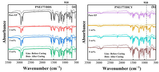 The final epoxy group curing degree can be obtained via FT-IR spectra as shown in Figure 10; the absorption peak of the epoxy group (about 910 cm−1) disappears after curing, which indicating that the epoxy group is completely involved in the cross-linking reaction between the PNE-177/DDS system and the PNE-177/DICY system during the curing process.