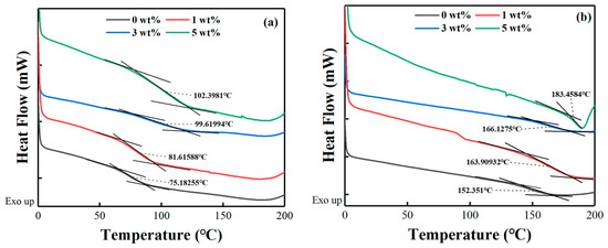 The glass transition temperature (Tg) is a key parameter that must be considered for thermal stability in polymeric applications. Figure 11 presents isothermal DSC plots of the cured epoxy for each system at a heating rate of 5 °C/min from RT to 300 °C. Tg can be determined by the inflection point of the DSC curve [65]. It can be seen that the Tg of the pure PNE-177/DDS system and PNE-177/DICY system was 75.18 °C and 152.3 °C, respectively. In each group of experiments, the addition of MXene significantly increased the Tg of the epoxy/curing agent system. This is because the Ti3C2 MXene filler added to the epoxy resin matrix can be used as a physical interlock point, which is intertwined by the epoxy resin chain, which is conducive to limiting the epoxy resin chain and reducing their movement [66,67].