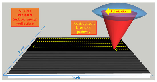 A 3D-view of the two separate boustrophedic fs-laser treatments of the diamond surface. The LIPSS nano-waves’ direction is orthogonal to the light polarization and their thickness is about half a micron. In the lower figure, the larger optical absorbance of the diamond surface after the second treatment is evidenced due to the increased defects’ densities [22].