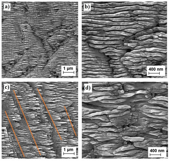 At the lower magnification (Figure 2a,c), a periodicity of about 170 nm is clearly revealed. For both the 2T-9010 and 2T-8020 samples, the energy released by the laser during the Y scan is able to modify the periodicity induced during the X-scan (the 10% and the 20% of the total energy, respectively). In the 2T-8020 sample, the reduction of the nanostructuring alignment is more evident in comparison to what is observed for the 2T-9010. The reduction of the periodicity formed by the first X-scan unavoidably leads to a slight broadening and a loss of continuity in the ripples and a major presence of diagonally oriented interrupting grooves (see orange lines of Figure 2c). Moreover, the distance between the interrupting grooves is much larger than the 170 nm width of the ripples. Although a deep understanding of the phenomena underlying this effect requires further investigations, we infer that said effect could be attributed to a strong reduction of the refractive index of the diamond-surface after the first X-scan.