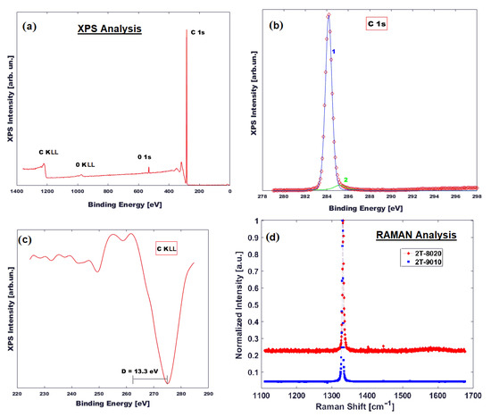 The XPS survey scan shown in Figure 3a demonstrates the presence of C and a small amount of O (~2 at.%), assigned to surface contamination. The peak-fitting analysis of C 1s signal was performed by introducing two synthetic peaks positioned at BE = 284.2 eV and 285.2 eV, assigned to the C–C bond and aliphatic carbon, respectively. As it is reported in reference [27], the peak-fitting analysis of the C 1s signal for carbon-based materials can lead to ambiguous conclusions, because the range of value for C–C hybridized sp2 and C–C hybridized sp3, is not well established. However, a more accurate method used to determine the carbon hybridization (sp3/sp2) state in carbon-based materials is based on the calculation of the D parameter. This parameter is defined as the distance between the most positive maximum and the most negative minimum of the first-derivative C KLL spectrum, and it is linearly dependent from the amount of C sp2 or C sp3 [23]. In our case, the obtained D value was 13.3 eV, which corresponds to 100% of C sp3.