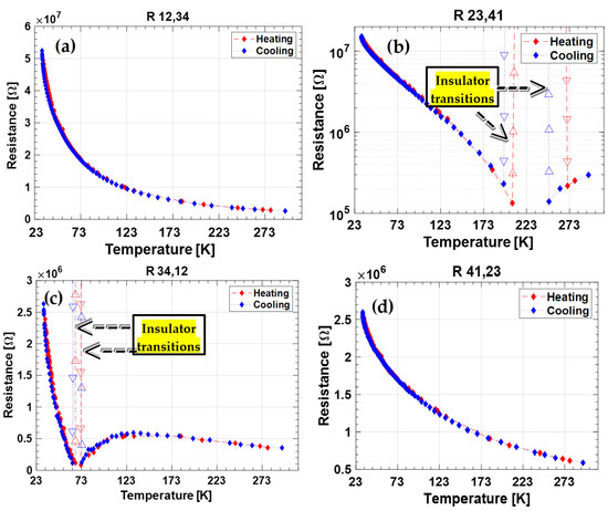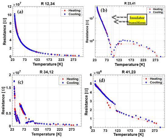 Measured resistance of sample 2T-9010 during the characterization performed following the Van der Pauw method. (a) Current injected at contacts 1–2; (b) current injected at contacts 2–3; (c) current injected at contacts 3–4; (d) current injected at contacts 4–1. The figure relative to the second cycle of both samples is represented on logarithmic y-axes in order to have eye-evidence over the NTC → PTC transition.