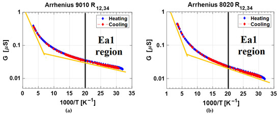 The experimental results reported in the previous section and summarized in Figure 3 and Figure 4 emphasize the difficulty of deriving the sheet-resistance of the material by a simple application of the Van der Pauw method. However, the data recorded at each temperature and acquired by the four-phase current-voltage measurements allowed us to highlight the peculiar behavior of the samples. R12,34 acquired on phase (i) displays a unique monotonic decrease in the 30–300 K range, for both the two samples, at each temperature, and for both the cooling and heating cycles. In order to get more insight into the conduction mechanisms of the nanotextured surface, Figure 6 reports the Arrhenius plot of conductance, previously illustrated as resistance in Figure 3a and Figure 4a. The experimental results clearly show the presence of two activation regimes with a slope change around 50 K. In order to evaluate the activation energies in the cryogenic temperature range for the two samples, we considered two thermally activated populations of conducting charges. The conductance of the samples can be expressed as: