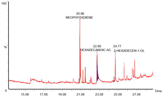 The B. lacera leaf extract was analyzed using a Perkin Elmer (model Clarus 600 T, Waltham, MA, USA) mass spectrometer. An Elite 5MS column (30 m × 0.25 mm × 0.25 μm film thickness), at a flow rate of 1 mL/min helium carrier gas was used. A splitless injector at 20:1 was used, and the temperature was maintained at 280 °C. The temperatures of the MS ion source and inlet line were 200 °C and 220 °C, respectively. The GC-MS scan range was fixed at 40–600 mass ranges at a 70 eV energy level. Analysis time was 58 min for each sample.