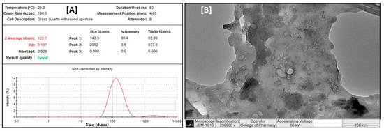 Particle size distribution (A) and TEM data (B) of liposomal preparation of the B. lacera leaf extract.