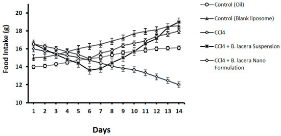 Effect of B. lacera leaf extract and its liposomal preparation on food intake of CCl4-treated rats for14 days. Data are presented as mean ± standard error of mean, where n = 6.