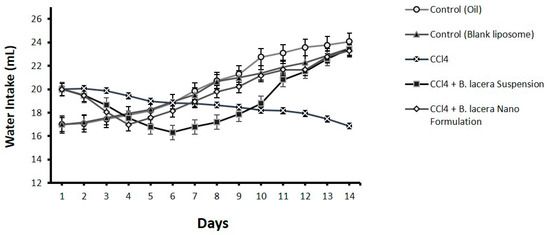 Effect of B. lacera leaf extract and its liposomal preparation on water intake of CCl4-treated rats for14 days. Data are presented as mean ± standard error of mean, where n = 6.