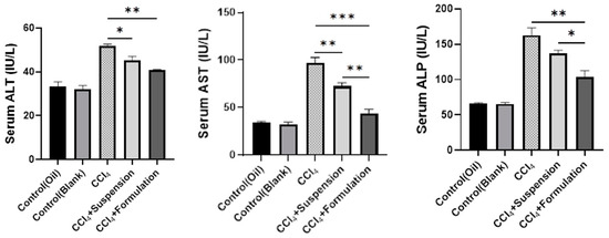 Effect of B. lacera leaf extract and its liposomal preparation on liver biomarker levels. Data are presented as mean ± SEM, n = 6. where * p ≤ 0.05, ** p ≤ 0.01, *** p ≤ 0.001, when compared between the CCl4, CCl4+ suspension and CCl4+ formulation (liposomal) groups. p ≤ 0.05 was considered statistical level of significance for all cases.