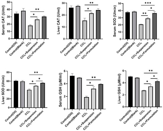 Effects of B. lacera leaf extract and its liposomal preparation on liver antioxidant enzymes. Data are presented as mean ± SEM, n = 6. where * p ≤ 0.05, ** p ≤ 0.01, *** p ≤ 0.001, when compared between the CCl4, CCl4+ suspension and CCl4+ formulation (liposomal) groups. p ≤ 0.05 was considered the statistical level of significance for all cases. CAT: Catalase, GSH: Glutathione, SOD: Superoxide dismutase.