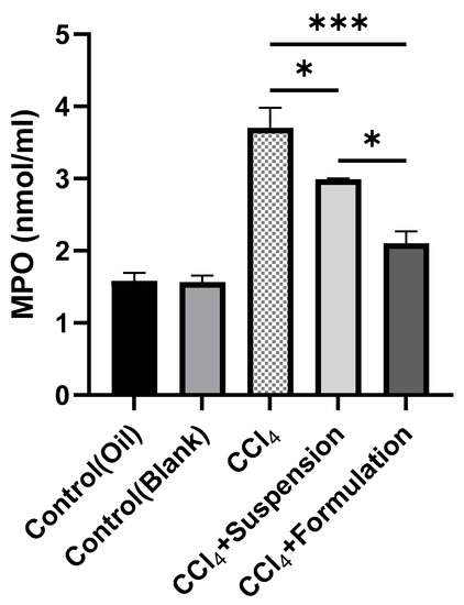 Myeloperoxidase (MPO) activities in liver tissues were measured to assess liver inflammation and liquid permeation in liver cells. MPO activity increased significantly in the liver of CCl4-intoxicated rats compared to control groups rat, which was significantly decreased when treated with B. lacera leaf extract (p ≤ 0.05) and its liposomal preparation (p ≤ 0.001) (Figure 9). In this case, similarly, the B. lacera nano liposomal preparation treatment group showed significantly better normalization of MPO (p ≤ 0.05) compared to the B. lacera leaf extract suspension treatment group (Figure 9).