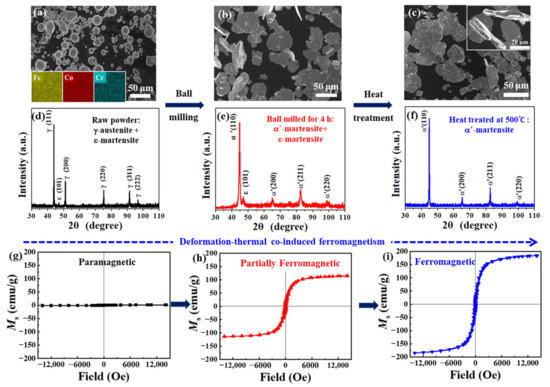 SEM images, XRD spectra and hysteresis loops of (a,d,g) raw FeCoCr powders, (b,e,h) those after ball milling for 4 h, and (c,f,i) subsequent heat treatment at 500 °C. Insets in (a) is the energy dispersive X-ray spectroscopy images for element distribution, while that in (c) is the SEM image for lateral view of FeCoCr powders.