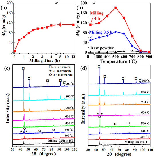 Different from Ms, the coercivity (Hc) showed the opposite behavior (see Figure S4 in Supplementary Information), i.e., it gradually decreased with the extension of milling time and showed a minimum value during subsequent thermal treatment. The decrease in Hc during deformation-thermal co-induced ferromagnetism may be attributed to the mutual exchange coupling of the martensite phase formed during milling [31]. At short milling time, the content of the martensite phase was low, and the magnetic domains were well separated from each other, leading to weak coupling interaction and high Hc. With the increase in the content of the martensite phase, the ferromagnetic coupling was enhanced, which resulted in the reduction of Hc. Further heat treatment below 500 °C caused an extra reduction of Hc due to the reduction of defects. At temperature higher than 500 °C, Hc gradually increased due to the inverse transformation of the martensite phase to the austenite phase.
