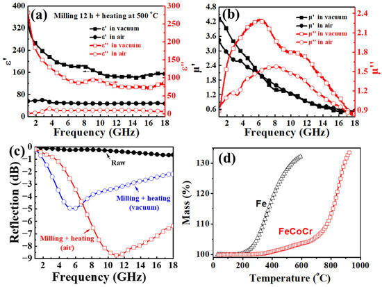 To show the potential application of the FeCoCr powders for efficient microwave absorption at elevated temperature, electromagnetic parameters, microwave absorption and thermogravimetry spectra of the FeCoCr powders were further studied. When considering the microwave absorption, the impedance matching between the air and the composite consisting of the FeCoCr powders and the polymeric matrix is vitally important. Generally, impedance matching determines the amount of microwaves entering the materials [49]. In our study, even though high permeability can be achieved by deformation-thermal co-induced ferromagnetism, i.e., of about 2.31 for the FeCoCr powders milled for 12 h and heat-treated at 500 °C in a vacuum, obtaining appropriate impedance matching is still the key issue. In Figure 4a, it can be seen that the complex permittivity of the FeCoCr powders was fairly high after ball milling for 12 h and heat treatment at 500 °C in a vacuum. The ε′ and ε″ in the X band reached 144~182 and 76~90, respectively; this lead to poor impedance matching and weak microwave absorption of the composite. To improve the impedance matching, the FeCoCr powders milled for 12 h were further heat-treated at 500 °C in the air to generate oxidation and insulate the surface to reduce the inter-particle eddy current upon incidence of the microwave. Compared to the FeCoCr powders heat-treated in a vacuum, those treated in air showed a significant reduction in complex permittivity, i.e., ε′ decreased to ~47, while ε″ reduced to ~9 over the X band. Even though the complex permeability of the FeCoCr powders decreased after heat treatment at 500 °C in the air, as shown in Figure 4b, the impedance matching of the material was still improved.