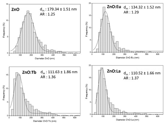 TEM micrographs from all samples exhibited in Figure 1 revealed highly crystalline particles of different morphologies, consisting of spherical, hexagonal, and rod-like shapes. In general, all size distributions are polydisperse and monomodal, ranging from 20 to 600 nm with a positive skewness (long tail on the right side). In particular, mean particle size revealed a decrease with doping from 180 nm for ZnO to 134 nm (ZnO:Eu), 110 nm (ZnO:Tb), and 111 nm (ZnO:La). Moreover, the aspect ratio factor increases from 1.25 for ZnO to 1.29 (ZnO:Eu), 1.36 (ZnO:Tb), and 1.37 (ZnO:La) (see Figure 2).