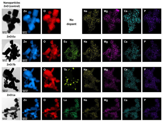 Figure 3. STEM images along with EDS elemental maps of undoped ZnO nanoparticles (control) and ZnO NPs doped with lanthanides (Eu, Tb and La).