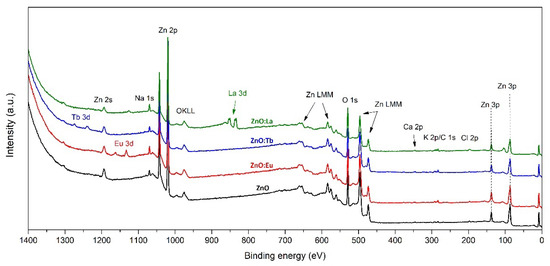To further investigate the chemical composition, XPS analysis was performed in all samples (ZnO, ZnO:Eu, ZnO:Tb, and ZnO:La). The wide energy spectra (0–1200 eV), presented in Figure 4, revealed the presence of Zn, O, Na, K, Ca and Cl, along with the intended lanthanide dopants (Eu, Tb, and La). In order to evaluate the elemental composition of the samples and the chemical states of the elements detected, high-resolution XPS spectra of Zn 2p, O 1s, Eu 3d, Tb 3d, La 3d, Na 1s, Ca 2p, K 2p, and Cl 2p photoemission lines were collected. Quantitative analysis of XPS spectra is presented in Table 2, where the at% of the intentional dopants is 1.81, 1.51, and 4.63% of Eu, Tb, and La, respectively, as expected from the synthesis. Binding energies of the main photoemission lines are listed in Table S2.