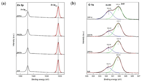 The deconvolution and quantifications of O 1s from Zn-OH groups yield values of 25.4% (ZnO), 30.2% (ZnO:Eu), 28.9% (ZnO:Tb), and 39.5% (ZnO:La), consistent with typical values of hydroxyl groups on Zn (25.6%) or O (33.8%) polar faces. The zinc-to-oxygen atomic ratios (Zn/O) are 0.94, 0.77, 0.82, and 0.60 for ZnO, ZnO:Eu, ZnO:Tb, and ZnO:La, respectively. Including the non-intentional dopant sodium and the intentional lanthanide dopant, the Zn/O ratio is 1.02 (ZnO), 0.92 (ZnO:Eu), 0.95 (ZnO:Tb), and 0.79 (ZnO:La). A ratio below 1 might indicate a zinc deficiency due to zinc vacancies, or oxygen in excess due to oxygen interstitials in the ZnO crystal structure.