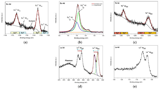 Similarly to Eu and Tb, lanthanum 3d core-level spectrum (Figure 6d) exhibits well defined La 3d5/2 and La 3d3/2 spin-orbit doublets, situated at 835.06 and 851.8 eV, respectively, with a spin-orbit splitting of 16.7 eV. Both spin-orbit doublets show a satellite at 3.5 eV higher binding energy due to multiplet splitting from the strong mixing of the core hole final-state configuration 3d94f0 with the charge transfer final state from the valence band (O 2p) to the La 4f orbital [44].