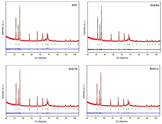 Figure 7. Rietveld refinement of ZnO, ZnO:Eu, ZnO:Tb, and ZnO:La samples. Experimental X-ray powder diffraction pattern is indicated by red dots, Rietveld-calculated profile by the black solid line and the difference between the observed and calculated patterns by the blue curve. Green vertical markers represent the calculated Bragg reflections of ZnO.