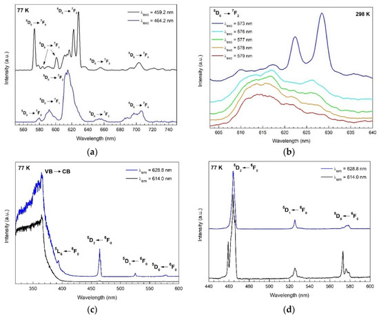 Figure 9. (a) Site-selective emission spectra of Eu3+ ions in ZnO:Eu at 77 K; (b) Site-selective emission spectra of 5D07F2 transitions from Eu3+ ions in ZnO:Eu at 298 K; (c) Site-selective excitation spectra of Eu3+ ions in ZnO:Eu at 77 K; (d) Magnified spectra (c) in the 440–600 nm region.