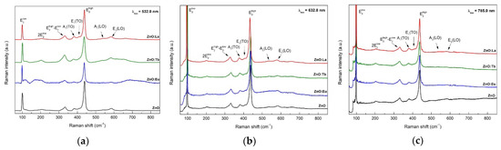 Figure 11. Raman spectra of ZnO, ZnO:Eu, ZnO:Tb, and ZnO:La under 532.0 nm (a); 632.8 nm (b); and 785.0 nm (c) excitation wavelength.