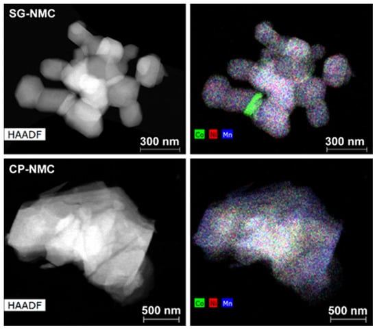 The HAADF-STEM image (left) together with the mixed Co/Ni/Mn element map (right) of representative particles from the Li1.2Ni0.13Mn0.54Co0.13O2 samples prepared with the solution-gel (top) and co-precipitation (bottom) method. The mixed element map of the SG-NMC sample reveals the presence of particles with an additional Co-rich phase.
