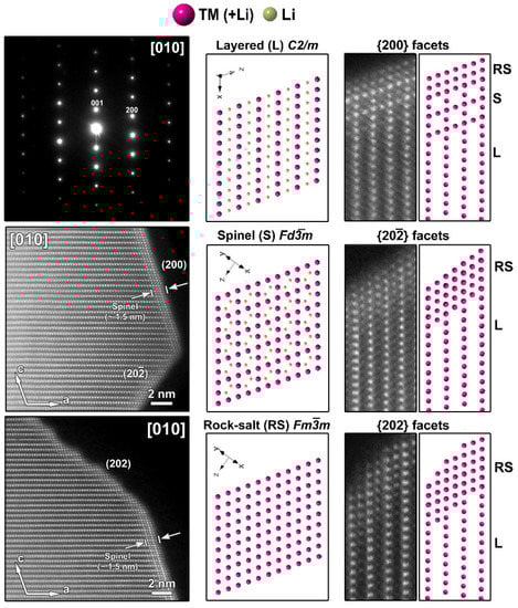 HAADF-STEM images of one particle of the cycled SG-NMC sample taken along the [010] orientation. Bottom close-up images show the structural degradation towards a spinel-type structure. The structural degradation mainly occurred at the facets (i.e., {202} and {}) that do not contain such initial spinel-type surface modification as the {200} facets.