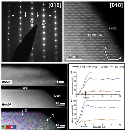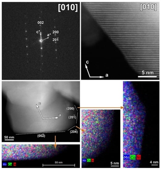 The typical atomic resolution [010] HAADF-STEM image of the CP-NMC illustrates the perfect arrangement of TM columns without positional disordering or any other structural modifications. Although particles of CP-NMC material in general do not have a polygonal shape, one of them with labeled crystal facets is shown in Figure 4. As illustrated by corresponding EDX element maps, no segregation of Co or Ni was observed at any of the facets.