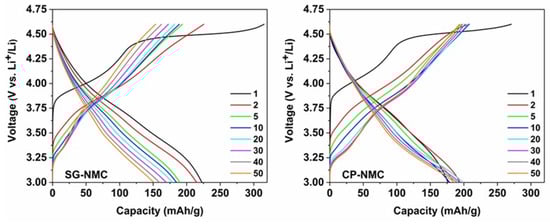 The electrochemical properties of the SG-NMC and CP-NMC samples were comparatively assessed via galvanostatic charge/discharge cycling. The materials were exposed to 50 charge/discharge cycles at a C-rate of C/10 in the voltage interval of 3.0 V–4.6 V vs. Li+/Li preceded by two formation cycles at C/20. The corresponding charge/discharge curves are plotted in Figure 5.