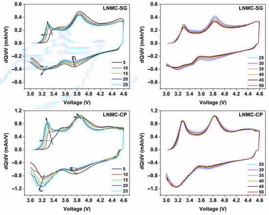 In order to gain insight into the different electrochemical behavior of the SG-NMC and CP-NMC samples, the differential capacity (dQ/dV) vs. voltage profiles derived from the galvanostatic charge/discharge data are shown in Figure 6.
