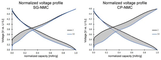The slope region of the initial charging step, centered around 3.8 V vs. Li+/Li (as derived from the dQ/dV vs. V profiles in Figure 6), involves cation oxidation (i.e., Ni2+ → Ni3+/4+ and Co3+ → Co4+). This is followed by a voltage plateau at about 4.5 V vs. Li+/Li attributed to oxygen redox processes eventually resulting in oxygen release. The observed voltage fade is higher for the CP-NMC sample than for the SG-NMC sample, which is indicated by the normalized voltage profiles shown in Figure 7. Voltage decay is observed in both the charge and discharge process, and the average voltage decay of SG-NMC and CP-NMC corresponds to approximately 88 mV and 173 mV, respectively, for 50 charge/discharge cycles.