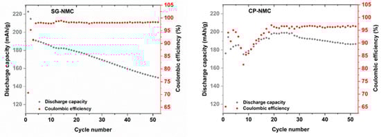 Discharge capacity and Coulombic efficiency vs. cycle number for SG-NMC (left) and CP-NMC (right).