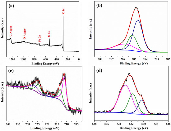 (a) XPS survey spectrum; high-resolution XPS spectra of (b) C 1s; (c) Fe 2p and (d) O 1s for CBC-Fe(II).
