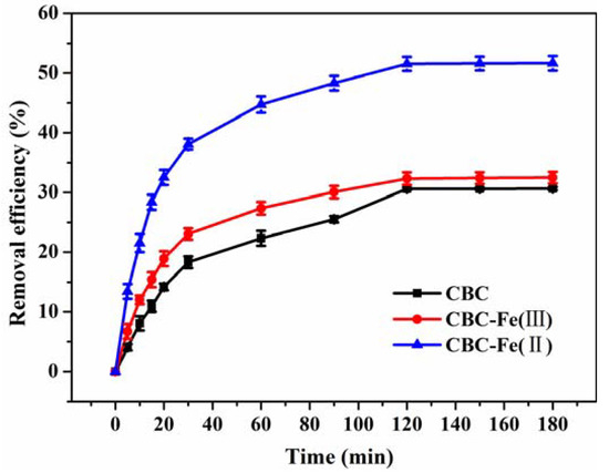 Figure 8 shows the influence of reaction time on the removal efficiency of RhB by CBC, CBC-Fe(III) and CBC-Fe(II) under the same reaction temperature. The results obtained revealed that the removal efficiency of CBC-Fe(II) to RhB was much higher than that of CBC and CBC-Fe(III), demonstrating that CBC-Fe(II) possessed a relatively strong driving force on RhB. It was evidently observed that the removal efficiency of the three samples to RhB increased quickly during the initial stage, which was attributed to the free adsorption sites available for a large number of dye molecules. However, with the increase in contact time, the number of adsorption positions gradually decreased, leading to a slower adsorption rate. Finally, the adsorption equilibrium was achieved after 120 min, when the removal efficiency became almost constant.