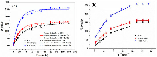 (a) Pseudo-first-order and pseudo-second-order and (b) intra-particle diffusion models of RhB adsorption by CBC, CBC-Fe(III) and CBC-Fe(II).
