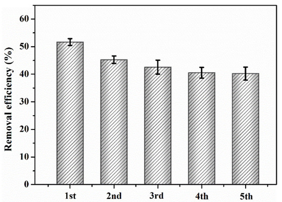 To investigate the regeneration and reusability of CBC-Fe(II), the adsorption experiment was conducted in five consecutive cycles. After each adsorption experiment, the adsorbent was recollected by a magnet and washed with absolute ethyl alcohol and ultrapure water, respectively. For the next adsorption cycle, 25 mL of RhB solution was added to CBC-Fe(II). The results of repetitive use of the adsorbent for RhB removal are shown in Figure 12. It can be seen that the regeneration efficiency of the CBC-Fe(II) decreased with each recycling process, which might be due to the increased RhB residual on the adsorbent surface. However, CBC-Fe(II) still possessed a certain adsorption capacity towards RhB after five adsorption cycles.