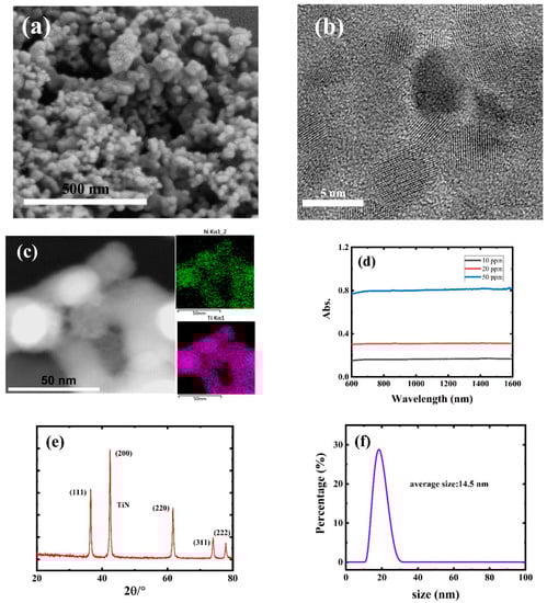 (a) SEM image. (b) TEM image. (c) EDX mapping result. (d) Linear optical absorption behavior. (e) XRD pattern and (f) DLS analysis of TiN QDs.