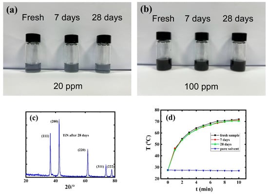 (a,b) Photographs of TiN QD solutions after different time durations (20 ppm for (a) and 100 ppm for (b)). (c) XRD pattern of the TiN QDs after 28 days and (d) photothermal behavior under irradiation with an 808 nm laser of a 50 ppm TiN QD solution after different time durations (laser power: 1 W/cm2).