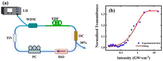 (a) Experimental diagram. (b) Nonlinear absorption transmission curve of TiN-QD SA.