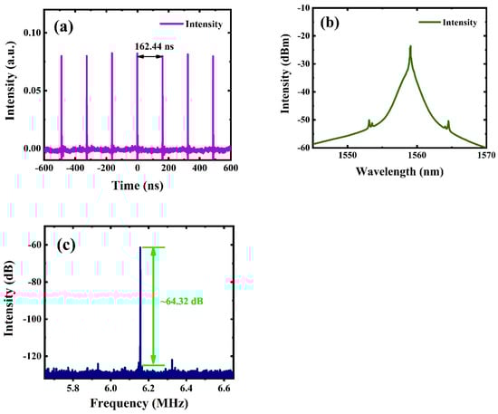 In this work, through an increase in the pump power and proper modulation of the angles of the PC, the laser realized stable mode-locked pulses at lower input power. When the pump power was 30.4 mW, the output characteristics of the laser can be seen in Figure 4. Figure 4a–c indicates the corresponding temporal trains, optical spectrum, and radio frequency (RF) spectrum, respectively. As can be clearly seen from Figure 4a, the fundamental repetition frequency had a temporal interval of ~162.44 ns, which corresponded to the repetition frequency of ~6.15 MHz, and the cavity length was ~33.4 m. Figure 4b displays the optical spectrum of the fundamental mode-locked pulses. Clearly, a peak appeared at the central wavelength of 1559 nm, and the bandwidth of 3 dB was 0.39 nm. At this time, the low pump power and weak pulse energy reduced the sideband intensity in the spectrum and made it inconspicuous []. When the pump power was continuously increased, this phenomenon improved: the sideband became more obvious, and the 3 dB bandwidth increased obviously. Furthermore, there was a high peak at 6.15 MHz in the RF spectrum, and the signal-to-noise ratio (SNR) was ~64.32 dB, which makes it clear that the laser operated in a relatively stable state, as shown in Figure 4c.