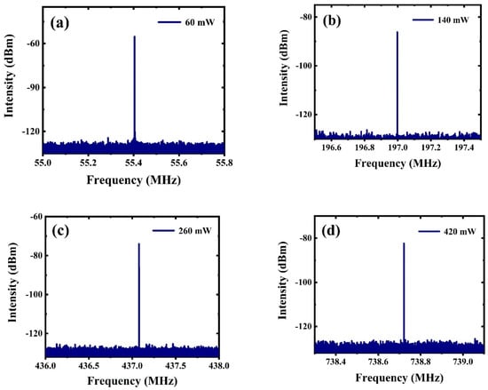 RF spectra of harmonic output pulses at 60 mW (a), 140 mW (b), 260 mW (c), and 420 mW (d).