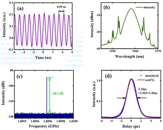 When the pump power increased gradually, stable harmonic mode-locked pulses were generated in the fiber laser by adjusting the PC. Figure 5a–d shows the RF spectra of different harmonic orders at pump powers of 60 mW, 140 mW, 260 mW, and 420 mW, respectively. When the pump power reached 60 mW, the repetition rate was 55.4 MHz, corresponding to the 9th harmonic order. Moreover, the repetition rates at 140 mW, 260 mW, and 420 mW were 197 MHz, 437.1 MHz, and 738.35 MHz, corresponding to the 32nd, 71st, and 120th harmonic orders, respectively. Figure 6 shows the characteristic diagram of the 164th harmonic pulse realized at the pump power of 580 mW. The temporal pulse trains are shown in Figure 6a. According to the figure, the temporal interval between adjacent pulses was ~0.99 ns, and the repetition frequency was about 1.009 GHz. Figure 6b shows the spectrogram in the same state. Clearly, the central wavelength and 3 dB spectral bandwidths were 1559 nm and 2.32 nm, respectively. Obvious Kelly sidebands were observed, which shows that optical solitons were generated in the fiber laser cavity. At this time, in this case, since the pump power level was higher than the fundamental repetition rate, the continuous wave component disappeared. As shown in Figure 6c, a clear high peak of ~1.009 GHz was observed, and the SNR was ~46.1 dB. The autocorrelation curve is presented in Figure 6d. The full width at half maximum (FWHM) was about 2.24 ps, and the pulse width was estimated to be 1.45 ps (assuming that the pulse was fitted by using the Sech2 curve). Thus, the calculation shows that the time-bandwidth product (TBP) was about 0.415 (the Sech2 pulse conversion limit is 0.315), which indicates that the output pulse was slightly chirped.